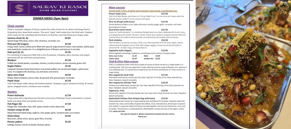 Experience the vibrant flavors of India at Saurav Ki Rasoi in Folkestone. Indulge in our highly-praised goat curry, pork vindaloo, and a diverse menu featuring vegan and vegetarian delights. Whether you're a couple or dining with friends, our affordable prices and delicious starters like pani puri await. Visit us at 31 Cheriton High St or call +44 1303 205969!